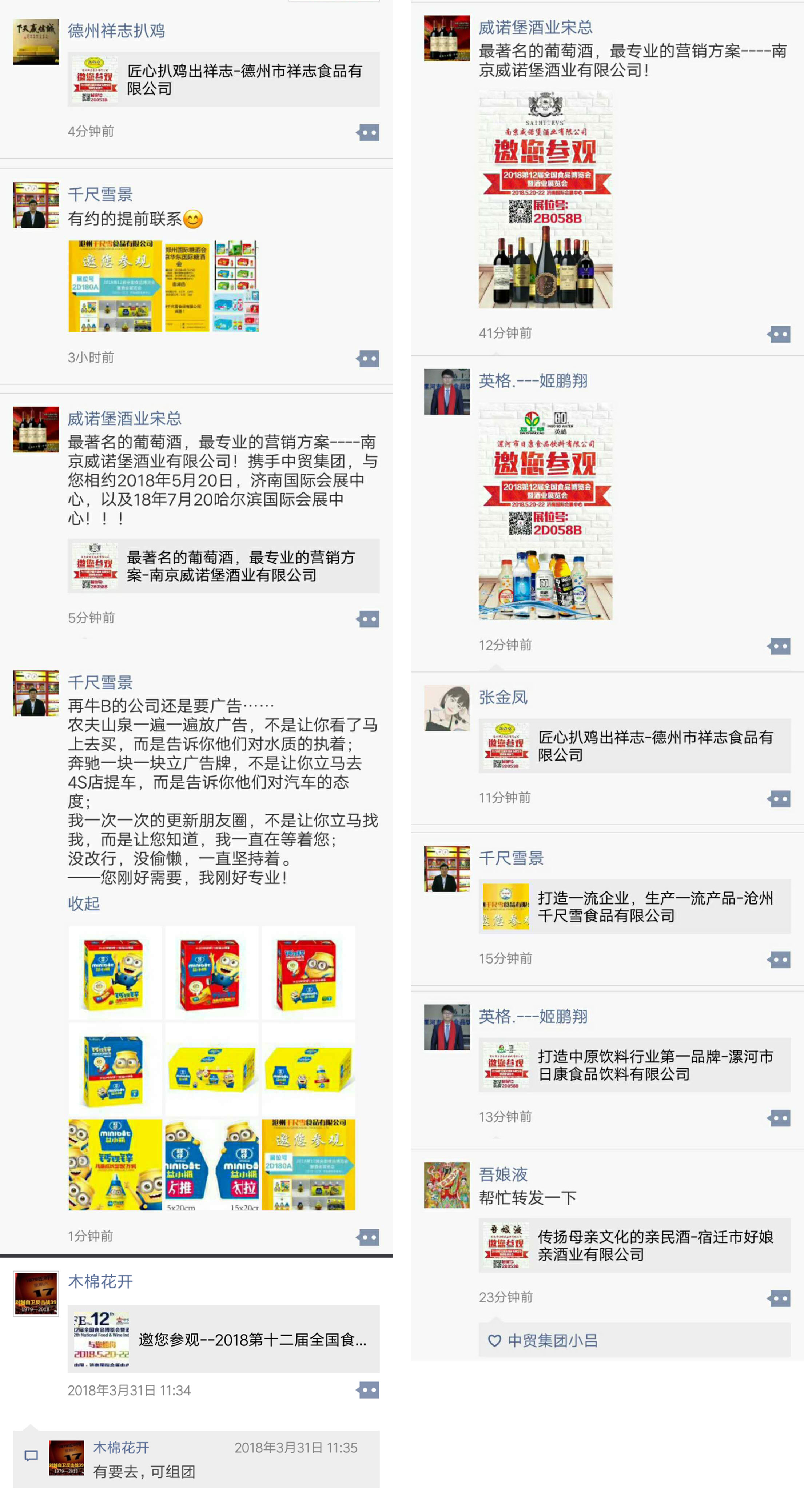 展商宣傳圖,宣傳文案,瘋狂的占據(jù)各個參展企業(yè)負責人的朋友圈,展會信息潛移默化的影響著每一位經(jīng)銷商,代理商。在各位展商積極的配合宣傳下,報名人數(shù)與日俱增,接下來會加大朋友圈的轉(zhuǎn)發(fā)力度,期待2018CNFE的精彩。